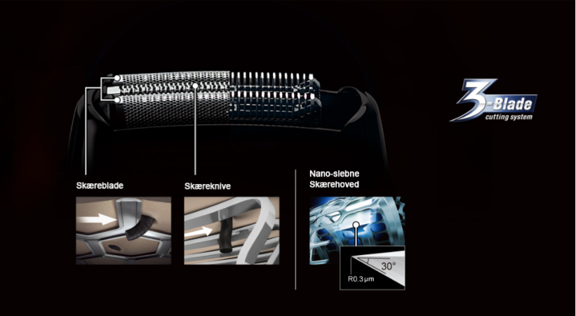 Tre blade afkorter skægstubbene og skærer nær rødderne, så du får en glat barbering. De dobbeltvirkende blade giver en hurtig og effektiv barbering. Desuden har de nano-slebne blade en 30° skærevinkel, som gør barberingen utroligt tæt.